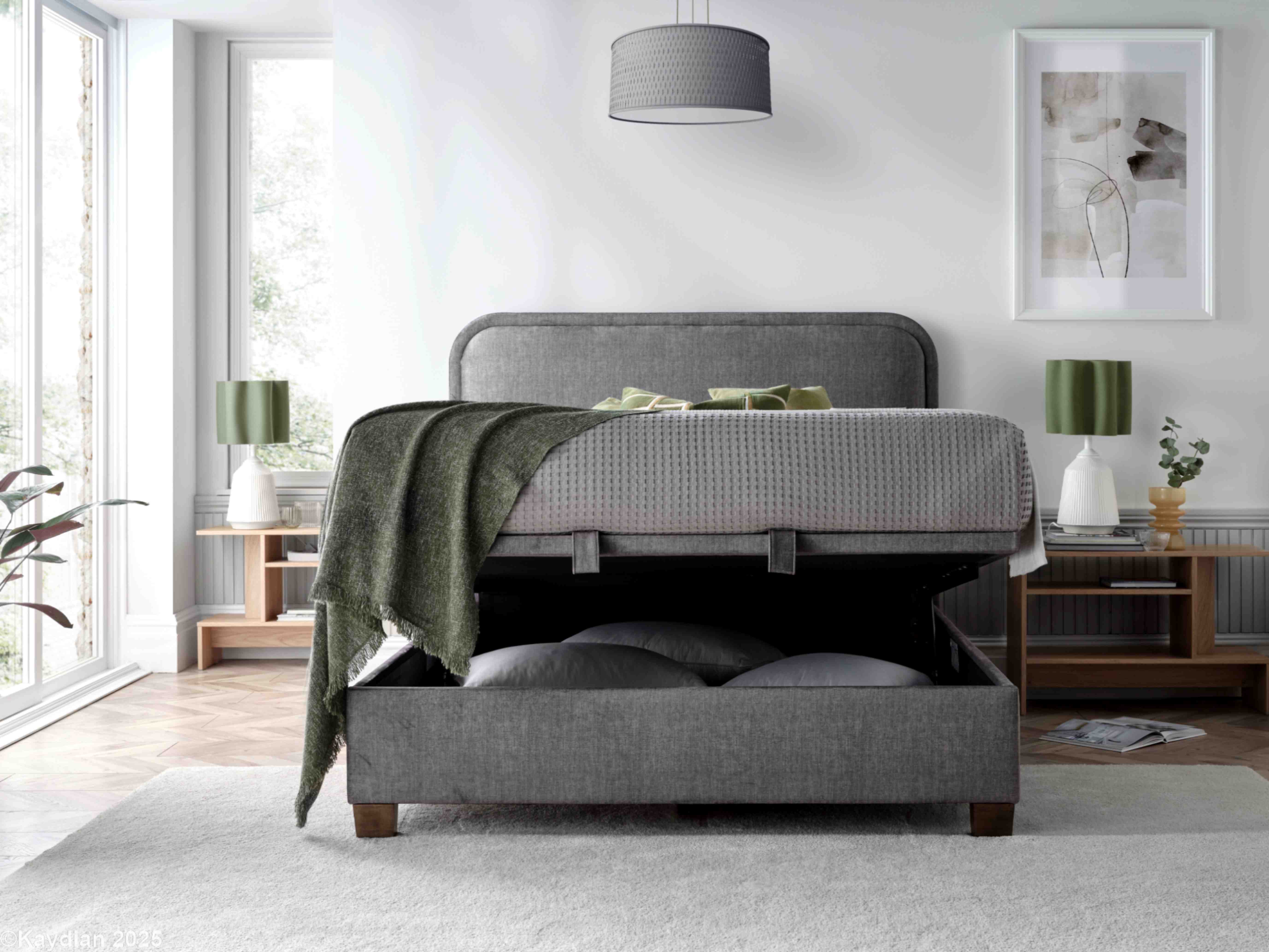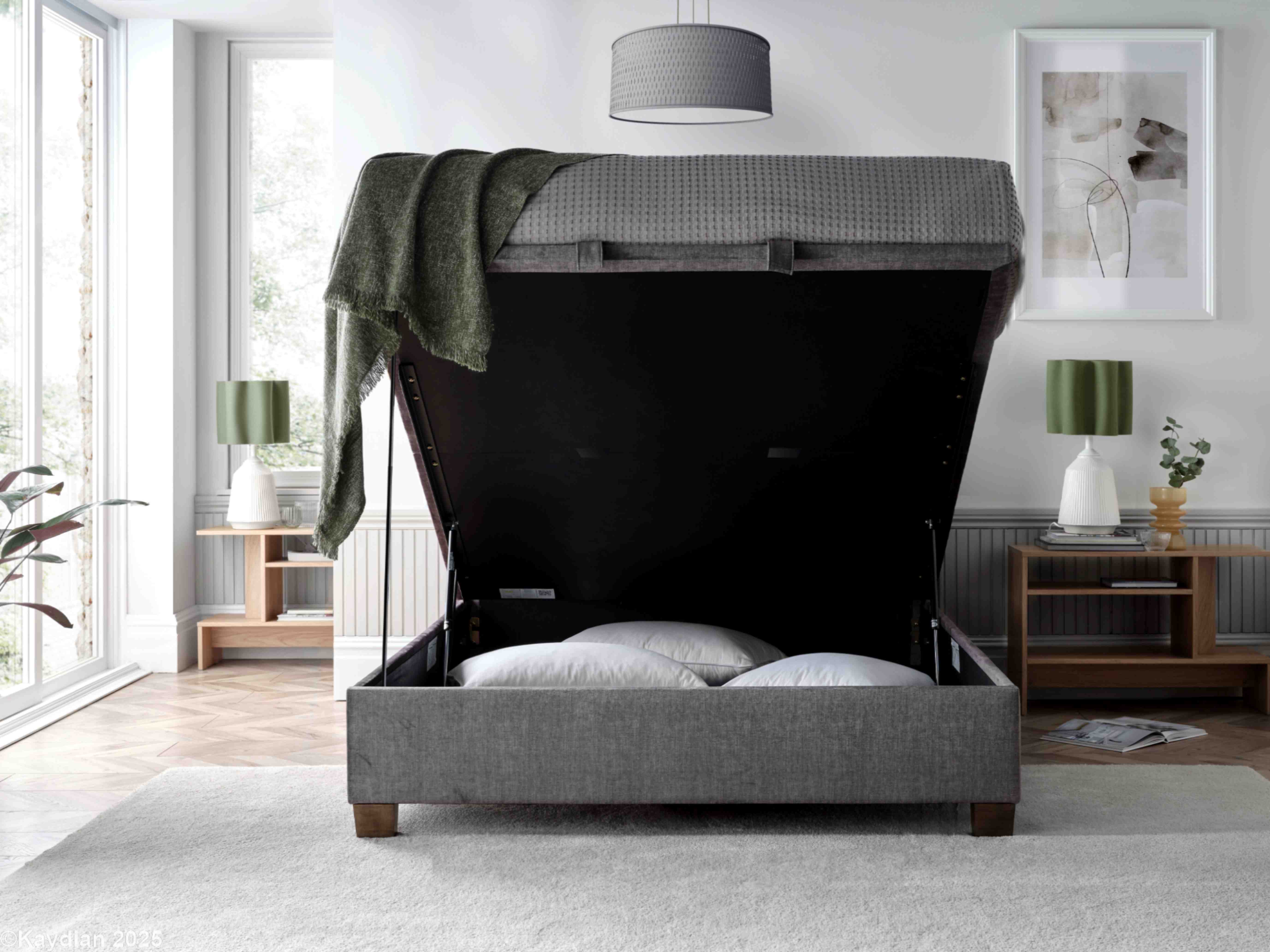 Lovingly crafted with a padded curved border edge headend to floor and hardwood footend feet. The Cliftons elegant silhouette really draws the eye.The spacious ottoman storage area can be easily accessed using the dual straps to activate the hydraulic assisted lift up system. Produced in high quality fabrics and wood from sustainable sources.