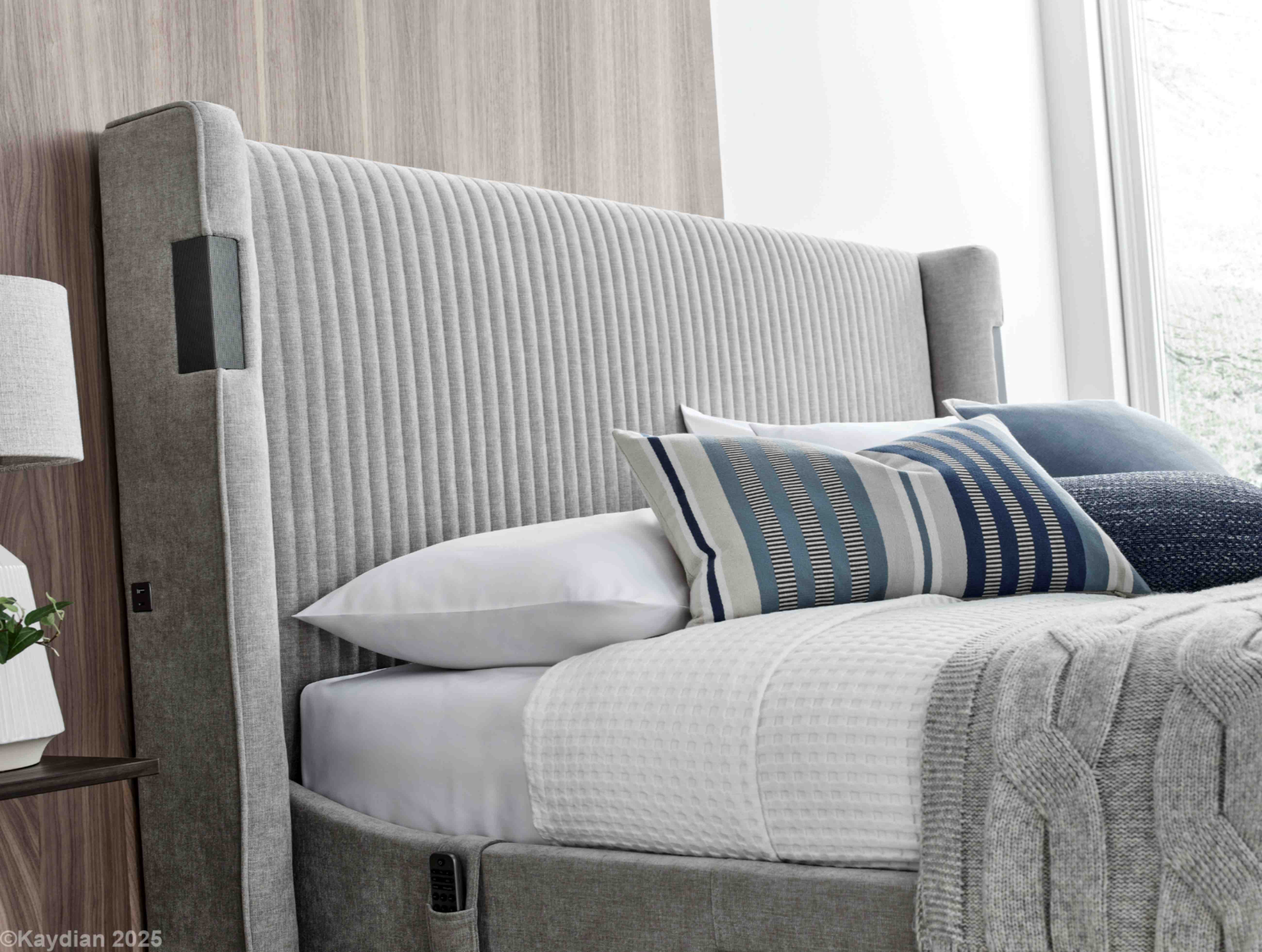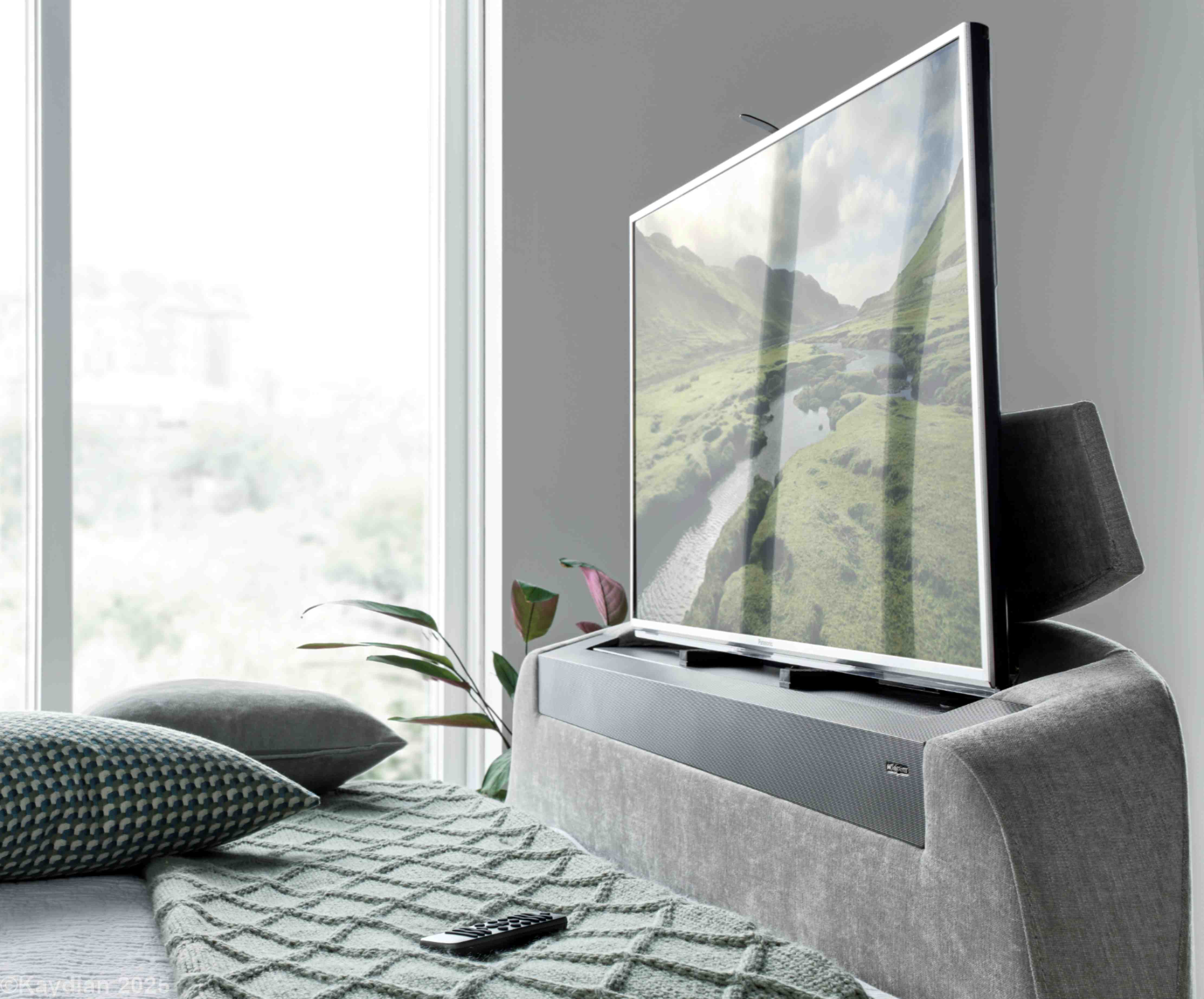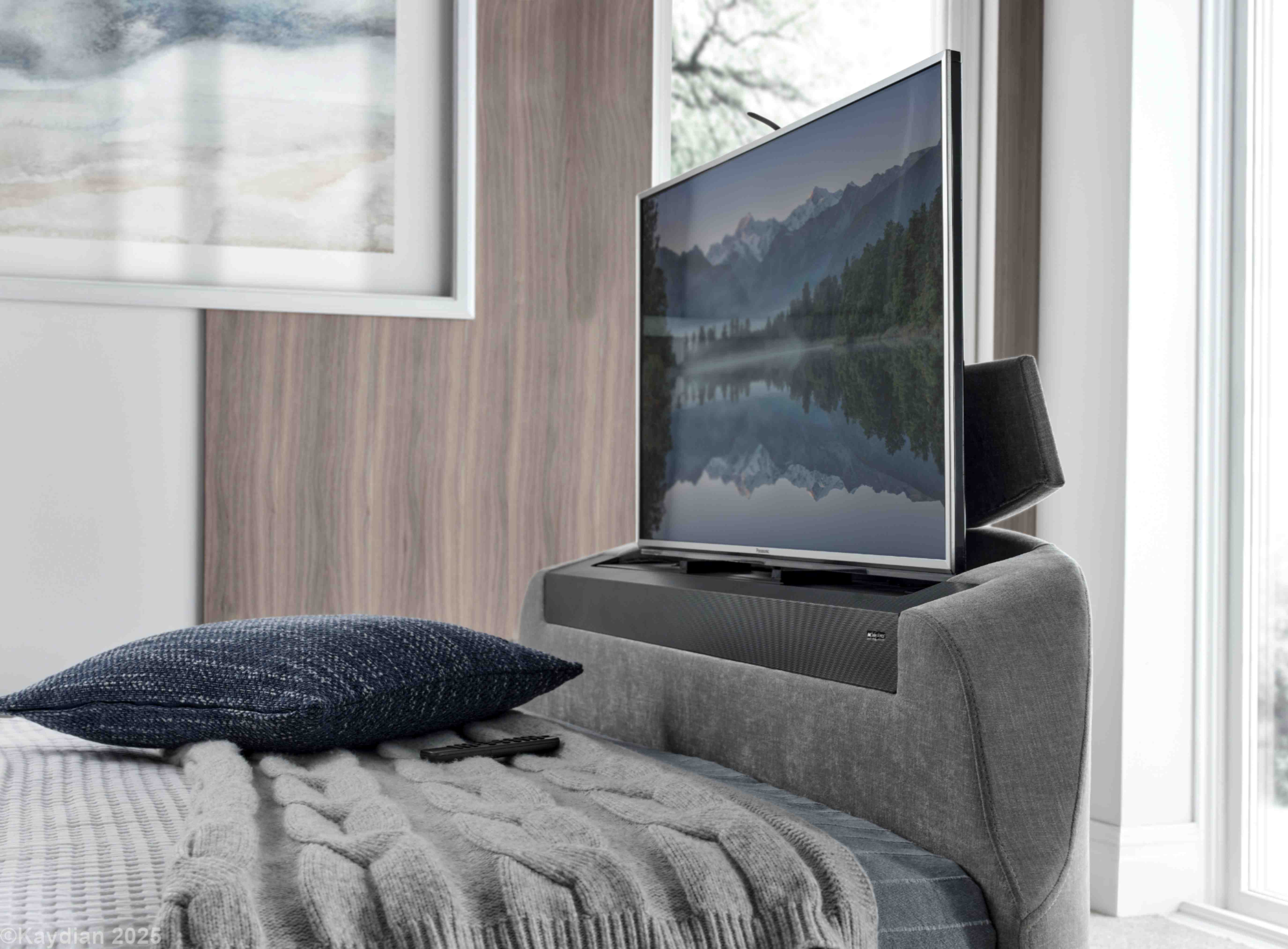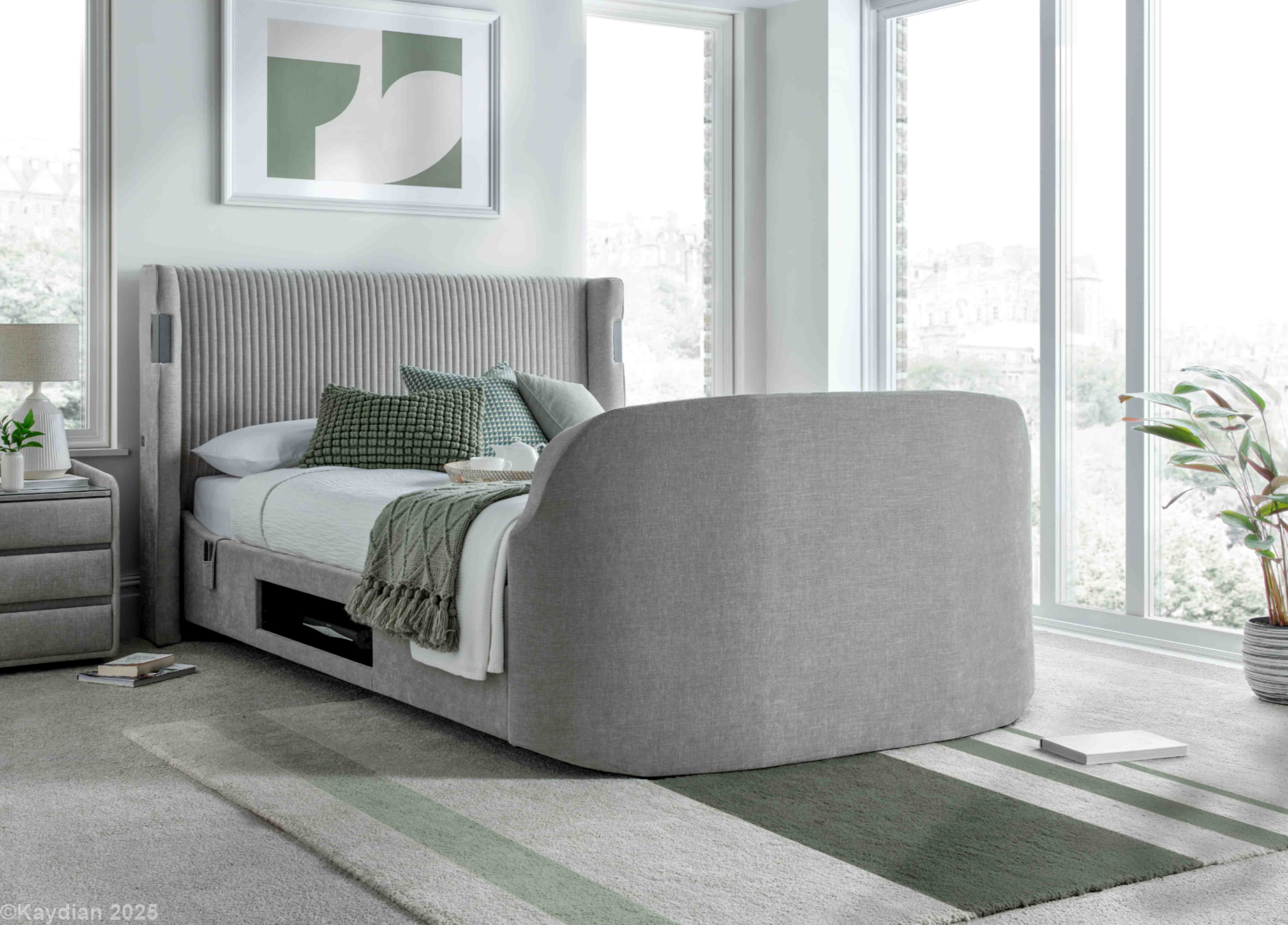 The latest in media bed technology with 5.1.2 Dolby Atmos surround sound system featuring headend and footend speakers to create a cinema style experience with remote control function. USB A&C ports are located either side of the headboard and 2 HDMI ports are situated in the footend, which houses up to a 43" TV. Produced in quality fabric and with wood from sustainable sources (Dolby Atmos ready when using a Dolby Atmos activated TV and watching Dolby Atmos broadcast entertainment)