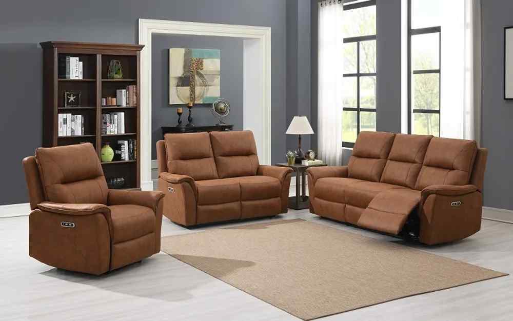power reclining and fixed options in a fabulous choice of Tan and Truffle easy clean fabric, just