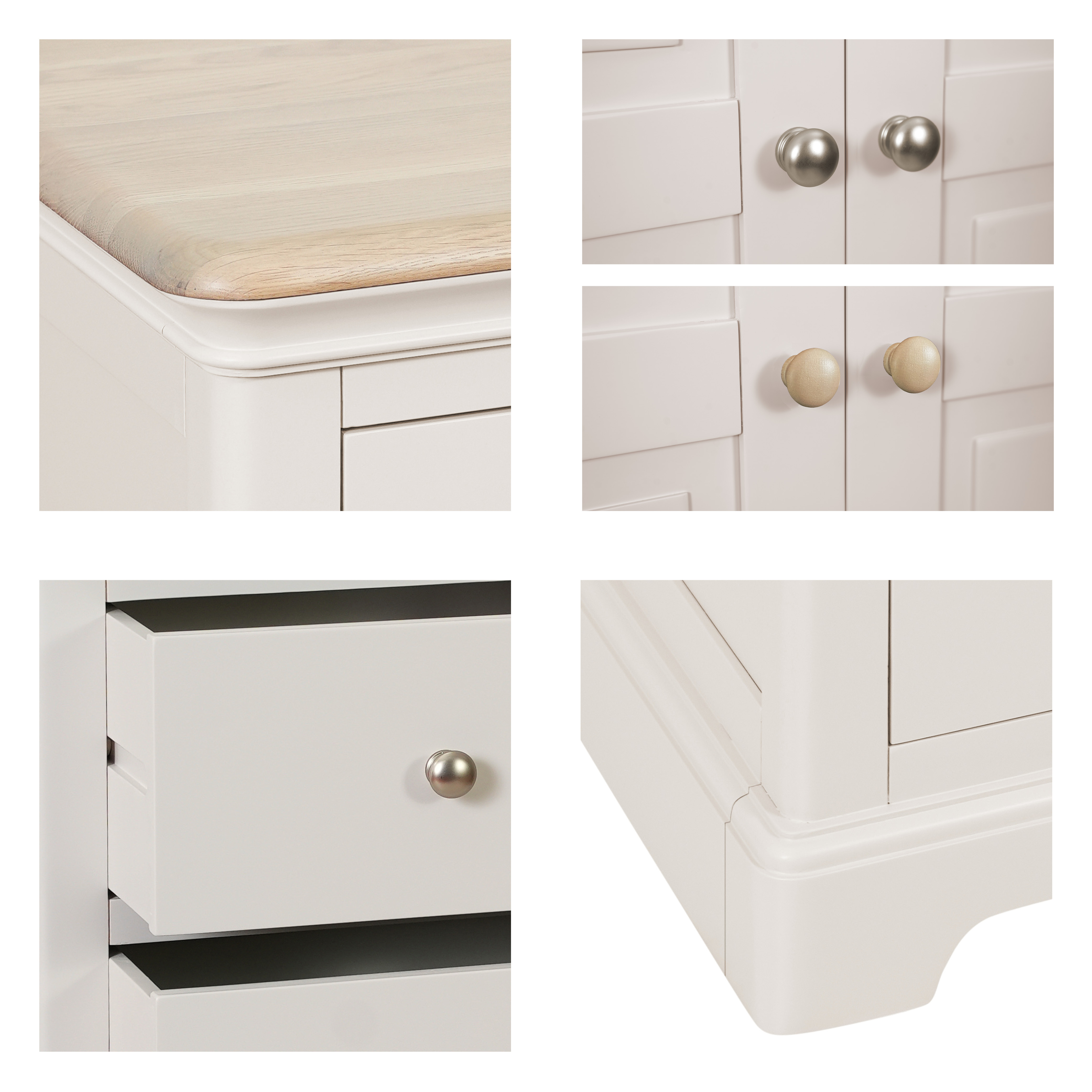 This painted bedroom collection evokes traditional craftsmanship, quality and timeless design elements with a contemporary twist. Designed in the UK, the range features elgant, gently curved mouldings and a long-lasting paint finish. Complemented by solid oak lightly finished tops that feature softly rounded corners.