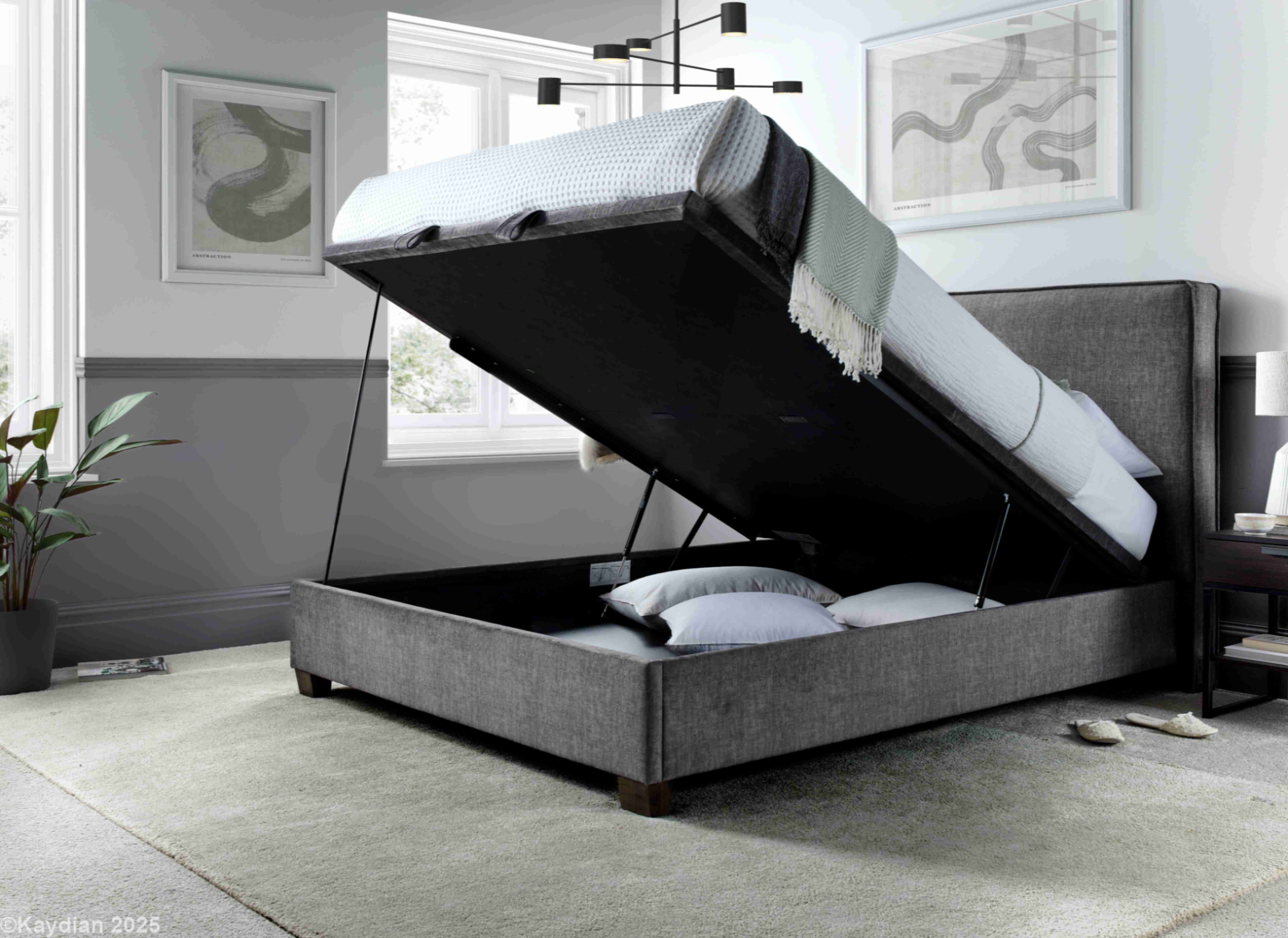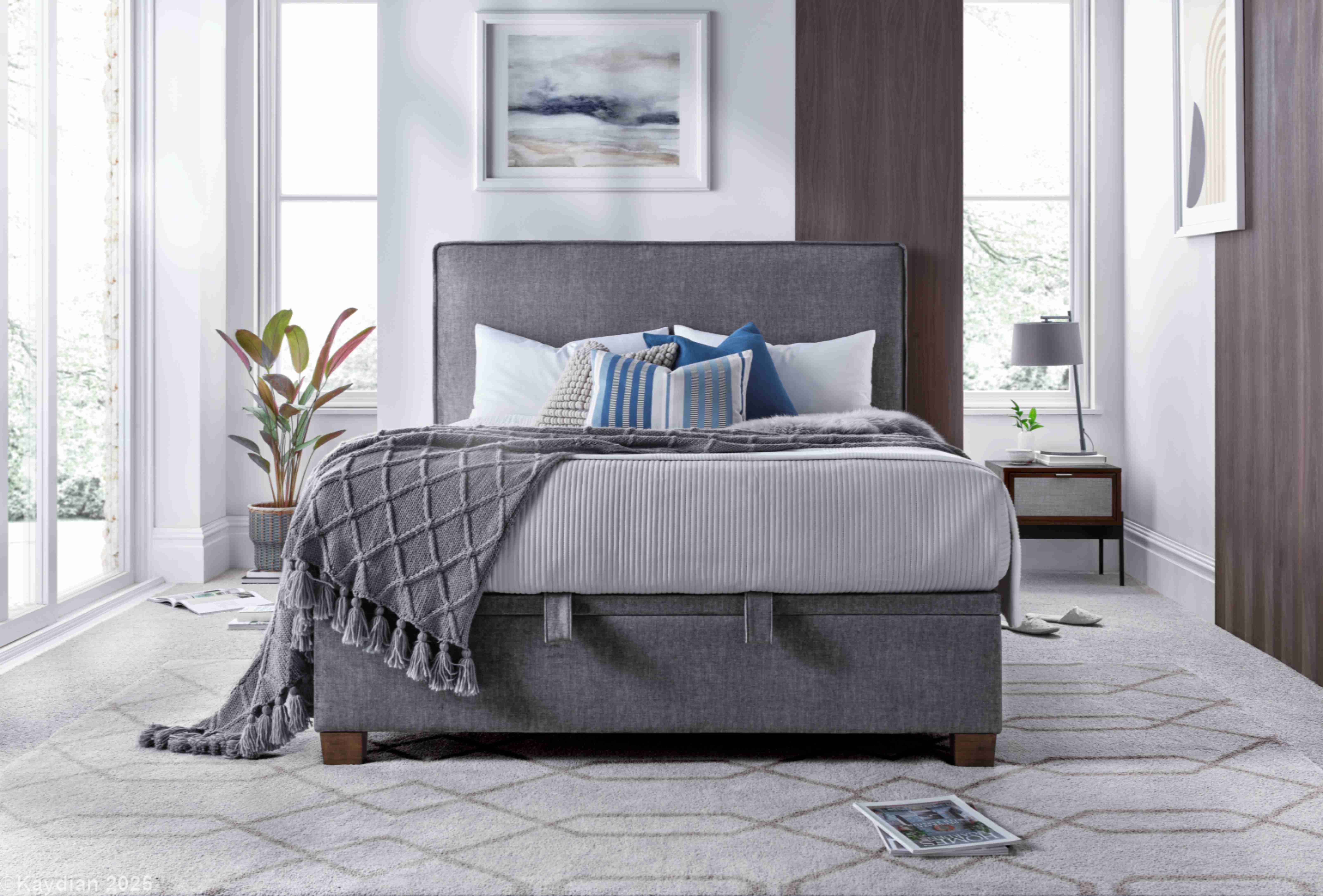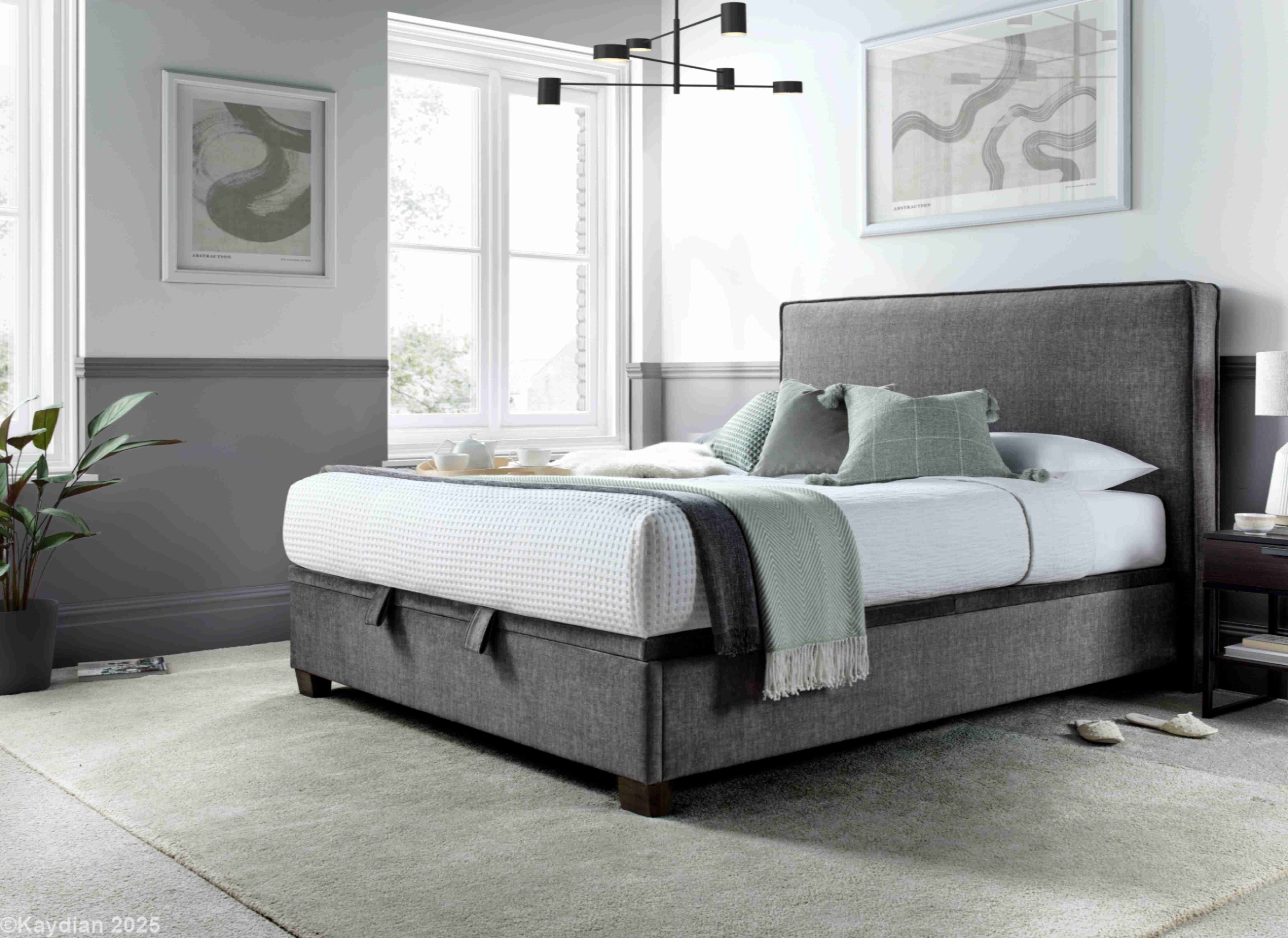 Featuring a bold chunky headend with piped border edging and integrated feet and a footend with dark brown hardwood feet. The spacious ottoman storage area provides a much desired storage facility suitable for concealing bedroom clutter and can be easily accessed using the dual straps to activate the hydraulic assisted lift up system. Produced in high quality fabrics and wood from sustainable sources.