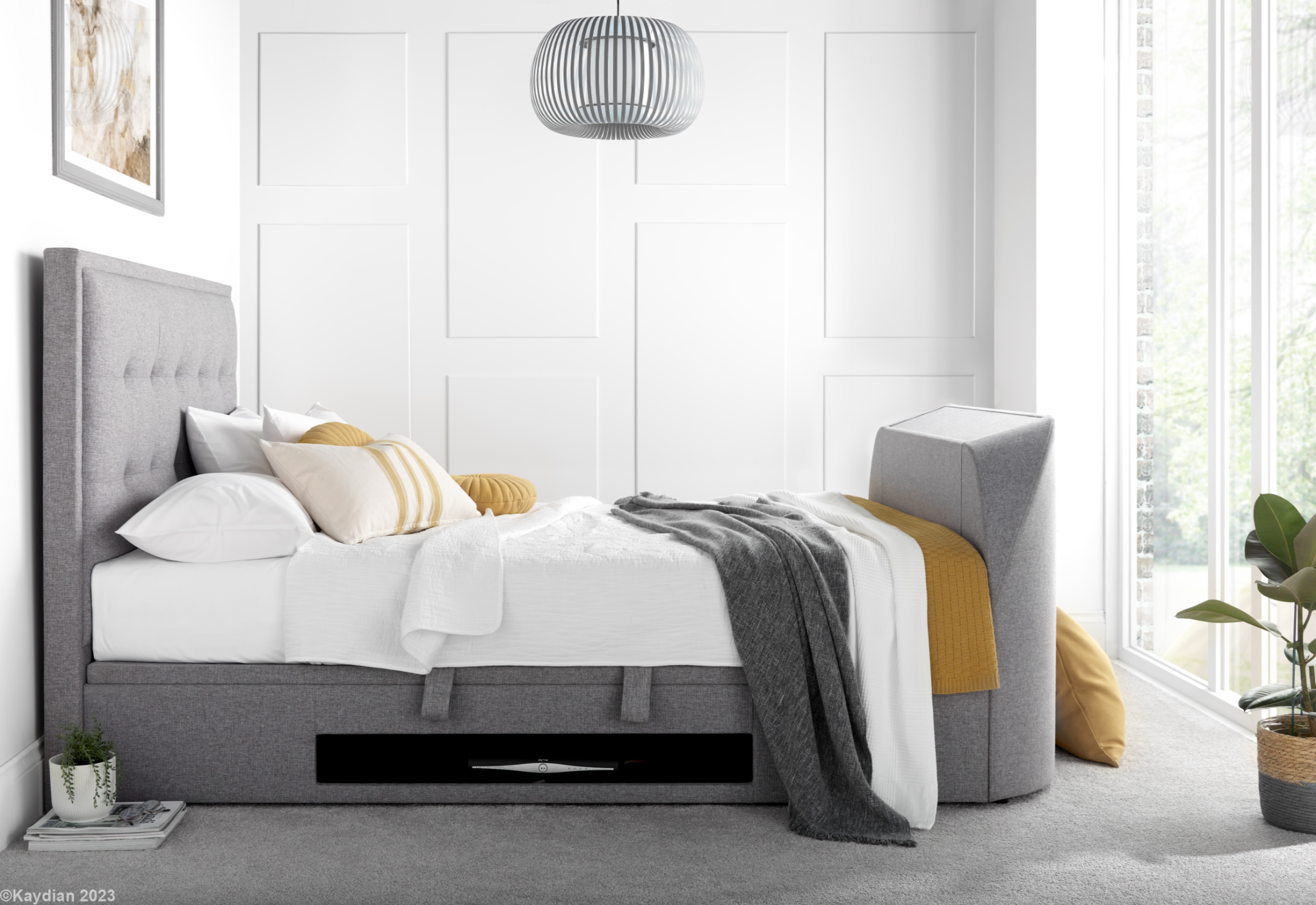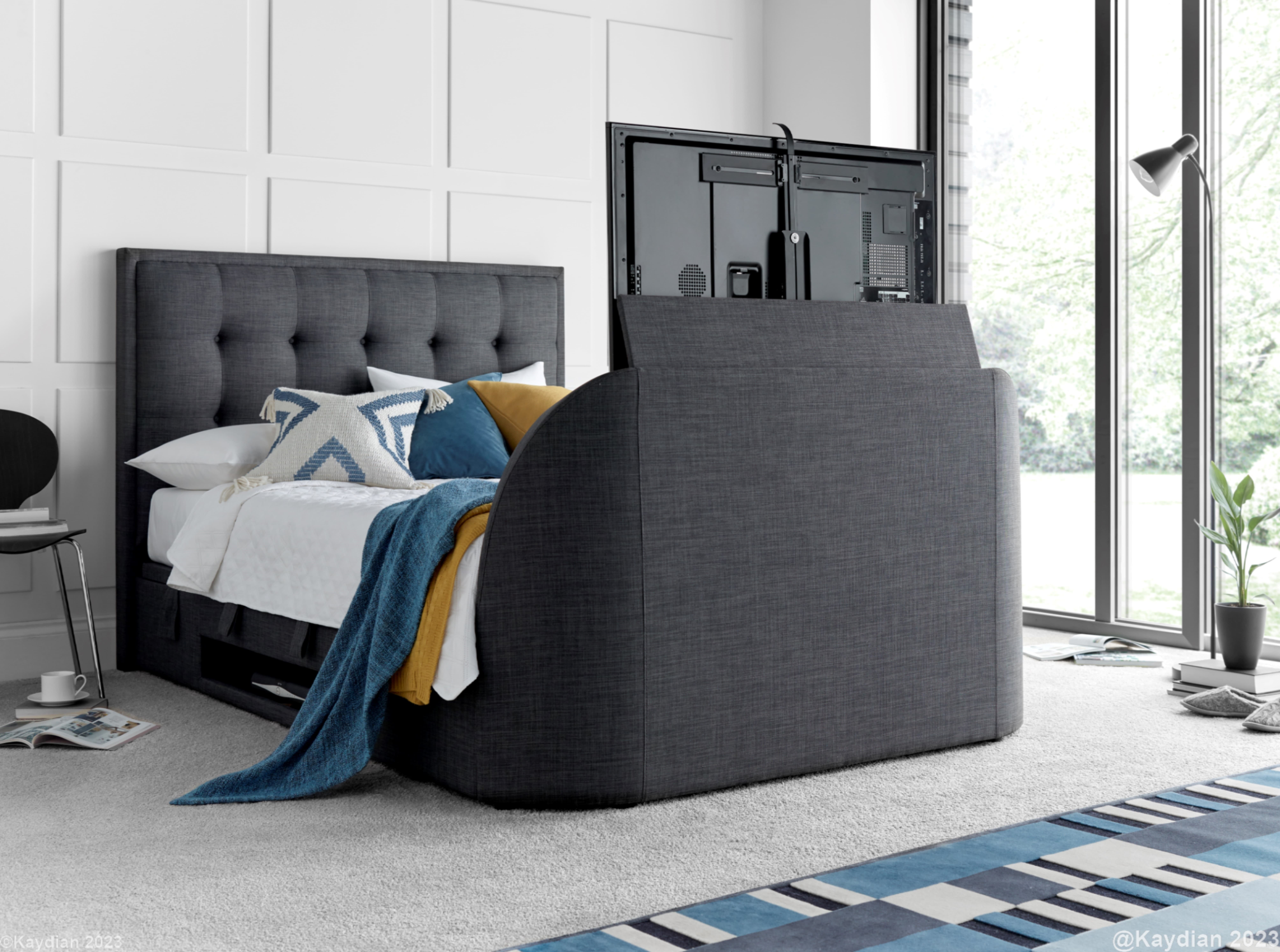 The Titan bed upholstered in soft charcoal grey fabric with imposing feature head board is the ultimate multimedia bed. A remote-controlled TV lift mechanism capable of accommodating up to a 43 TV (subject to TV dimensions and ports fittings) allows hideaway TV storage. The built-in speaker system has 8 directional speakers in the footend with a further 8 located in the headboard offering amazing sound with visible sound levels included on the remote control for easy adjustment This updated model has a built-in woofer and fewer connections for easier assembly and set up. Peripheral connections, headphone socket, aux and USB port, are located in each side of the head board for easy access. Dimensions and Colour Options Available in King (150 cm) and Super King (180) in Berwich Charcoal Fabric (100% Polyester)