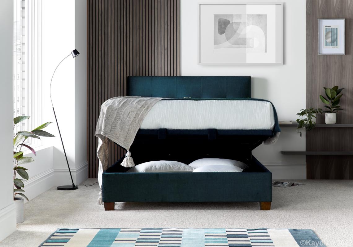 Ottoman storage bed with design head end manufactured with a NEW lift up system and incorporating a spacious floating floor storage area with elegant hardwood feet. The Walkworth has a platform style ventilated base. Maximum mattress weight 55 KG.
